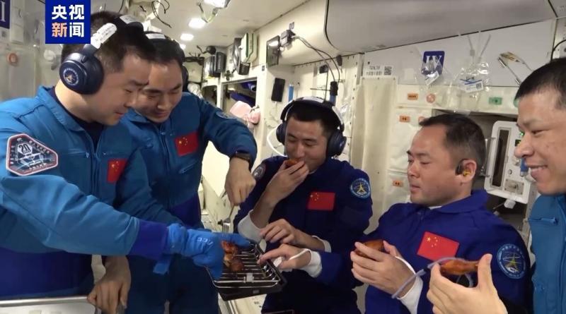 Сансрын станцад “Шэньжөү-20” “Шэньжөү-21” багийнхан тахианы далавч, үхрийн хавирга шарж идэж байна.