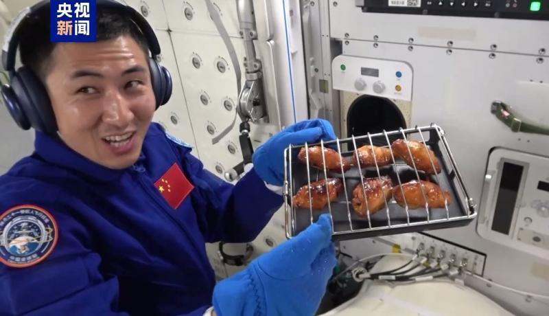 Сансрын станцад “Шэньжөү-20” “Шэньжөү-21” багийнхан тахианы далавч, үхрийн хавирга шарж идэж байна.